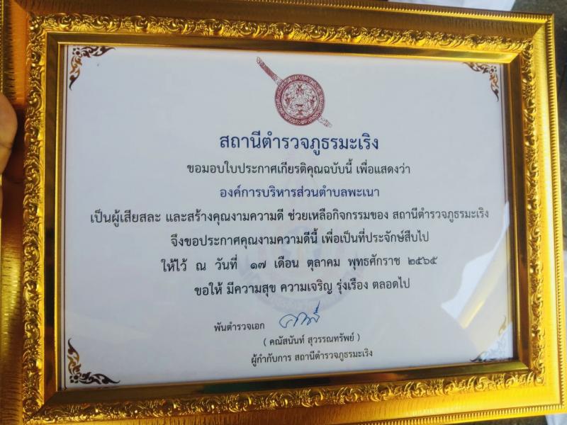 รายละเอียด : วันที่ 17 ตุลาคม 2565 นางสาวพัฒน์นรี กุลรัตนาพันธ์ นายกองค์การบริหารส่วนตำบลพะเนา พร้อมด้วยคณะผู้บริหาร ปลัดองค์การบริหารส่วนตำบลและหัวหน้าส่วนราชการ ร่วมงานวันสถาปนาสำนักงานตำรวจแห่งชาติ ประจำปี 2565 พร้อมรับมอบใบประกาศเกียรติคุณผู้เสียสละ และสร้างคุณความดี ช่วยเหลือกิจกรรม ณ สถานีตำรวจภูธรมะเริง อำเภอเมืองนครราชสีมา จังหวัดนครราชสีมา