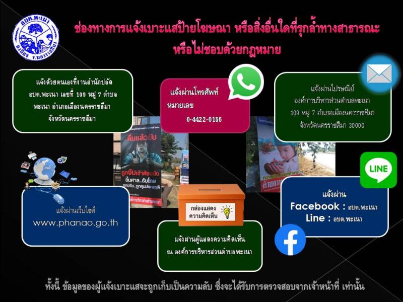 ประชาสัมพันธ์มาตรการการป้องกันและช่องทางการแจ้งเบะแสป้ายโฆษณา หรือสิ่งอื่นใดที่รุกล้ำทางสาธารณะหรือไม่ชอบด้วยกฎหมาย