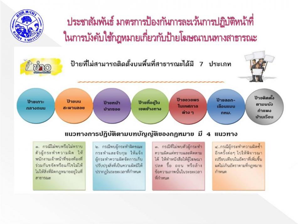ประชาสัมพันธ์มาตรการการป้องกันและช่องทางการแจ้งเบะแสป้ายโฆษณา หรือสิ่งอื่นใดที่รุกล้ำทางสาธารณะหรือไม่ชอบด้วยกฎหมาย [3 พฤษภาคม 2565]