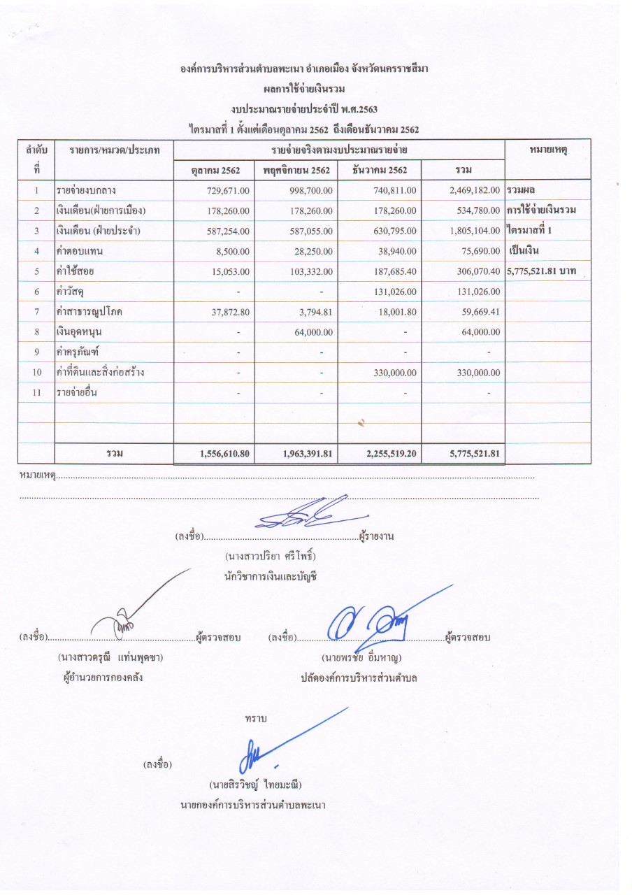 รายงานผลการใช้จ่ายเงินรวมไตรมาสที่ 1 ประจำปีงบประมาณ 2563